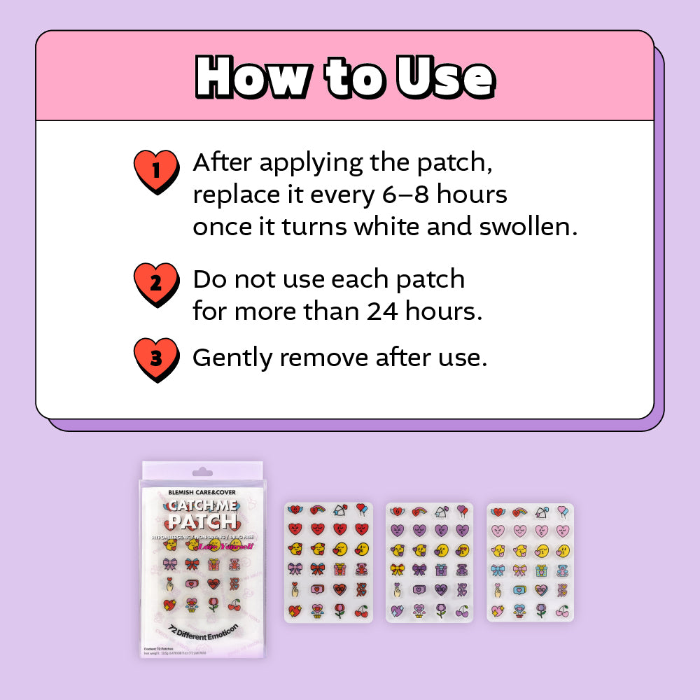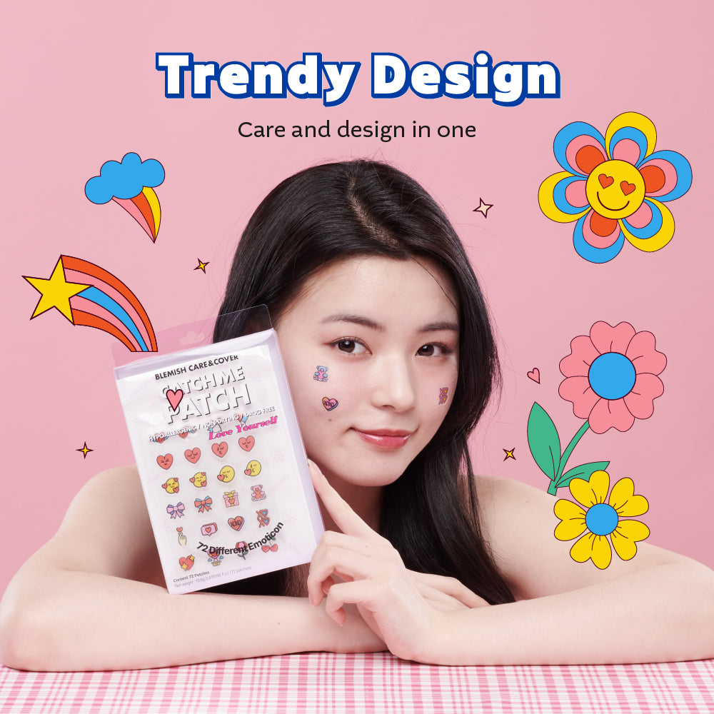 Add personality to your skincare ritual with the CATCH ME PATCH Emoticon Love Yourself set—a collection of 72 expressive hydrocolloid spot covers that make blemish coverage more fun and stylish. With charming emoji-like characters in various shapes and colors, you can mix, match, and wear patches that suit your mood.