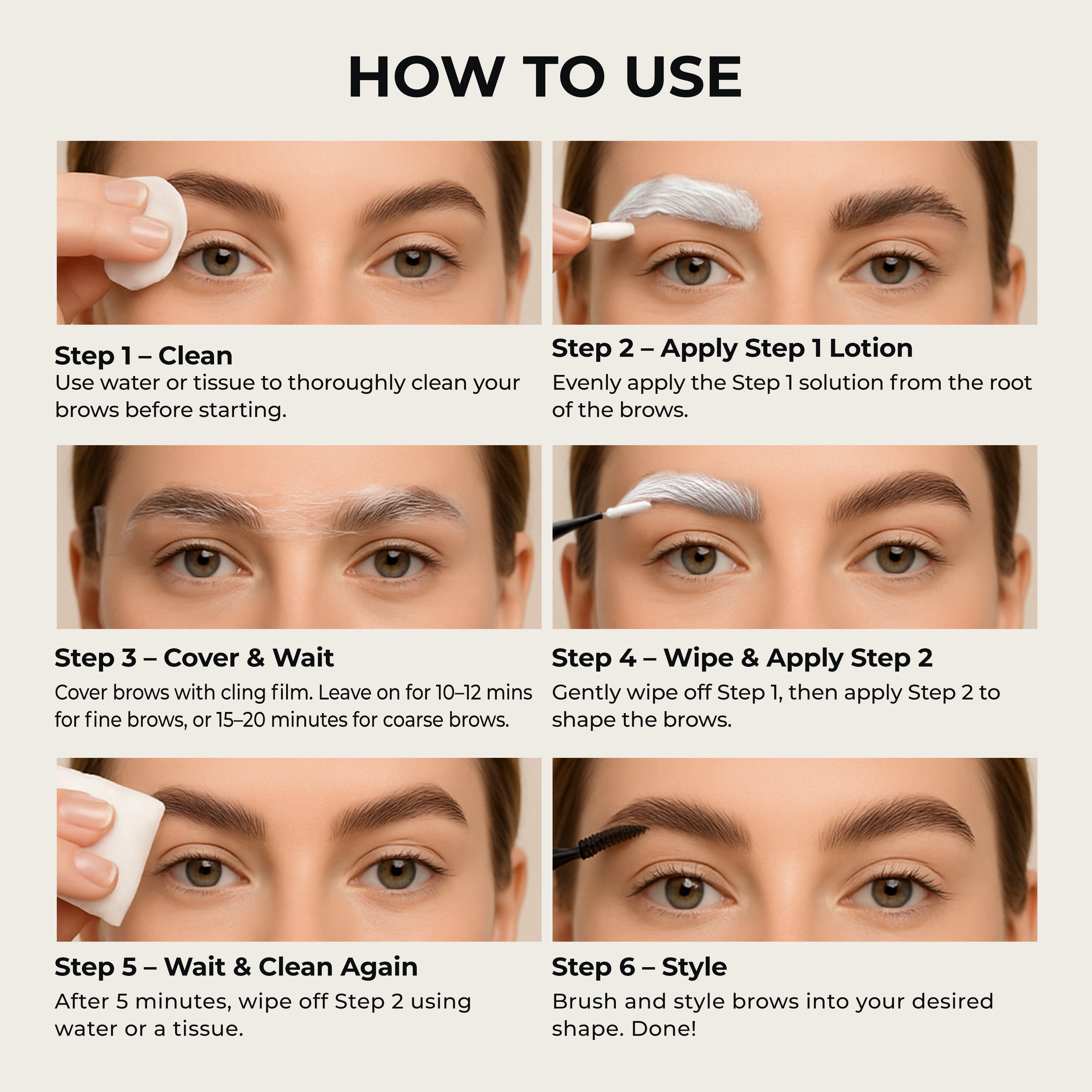 • Apply the first step evenly to the eyebrows and wipe it clean after 10 minutes when the softening is complete.