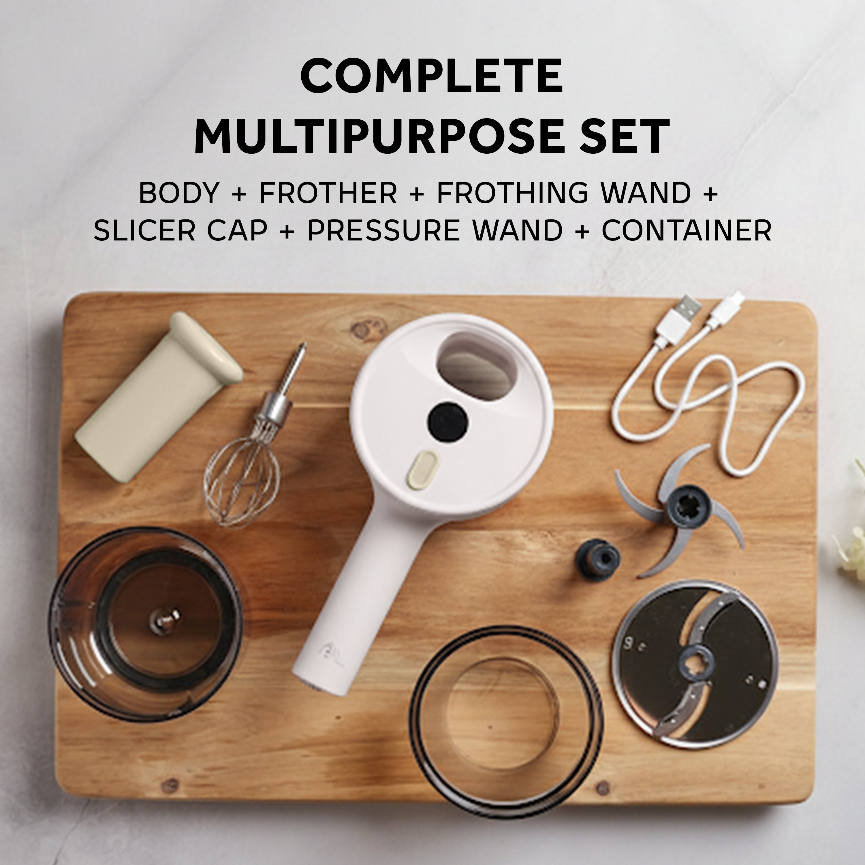 • The multi-functional Food Sitter set includes a frother, frothing wand, slicer cap, pressure wand, and waterproof container to support a variety of cooking tasks.