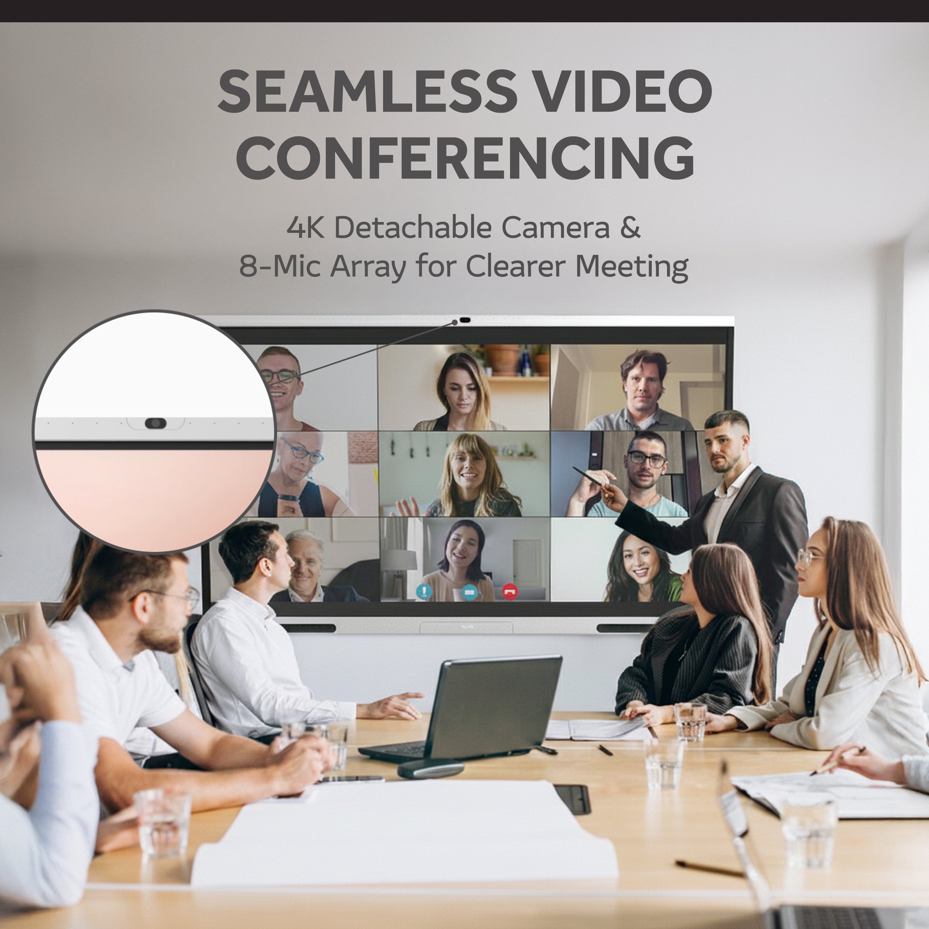 • Additional innovations include a detachable 4K UHD camera, an 8-microphone array, premium audio speakers, and versatile connectivity options—making it the ultimate solution for classrooms, conference rooms, and collaborative workplaces.