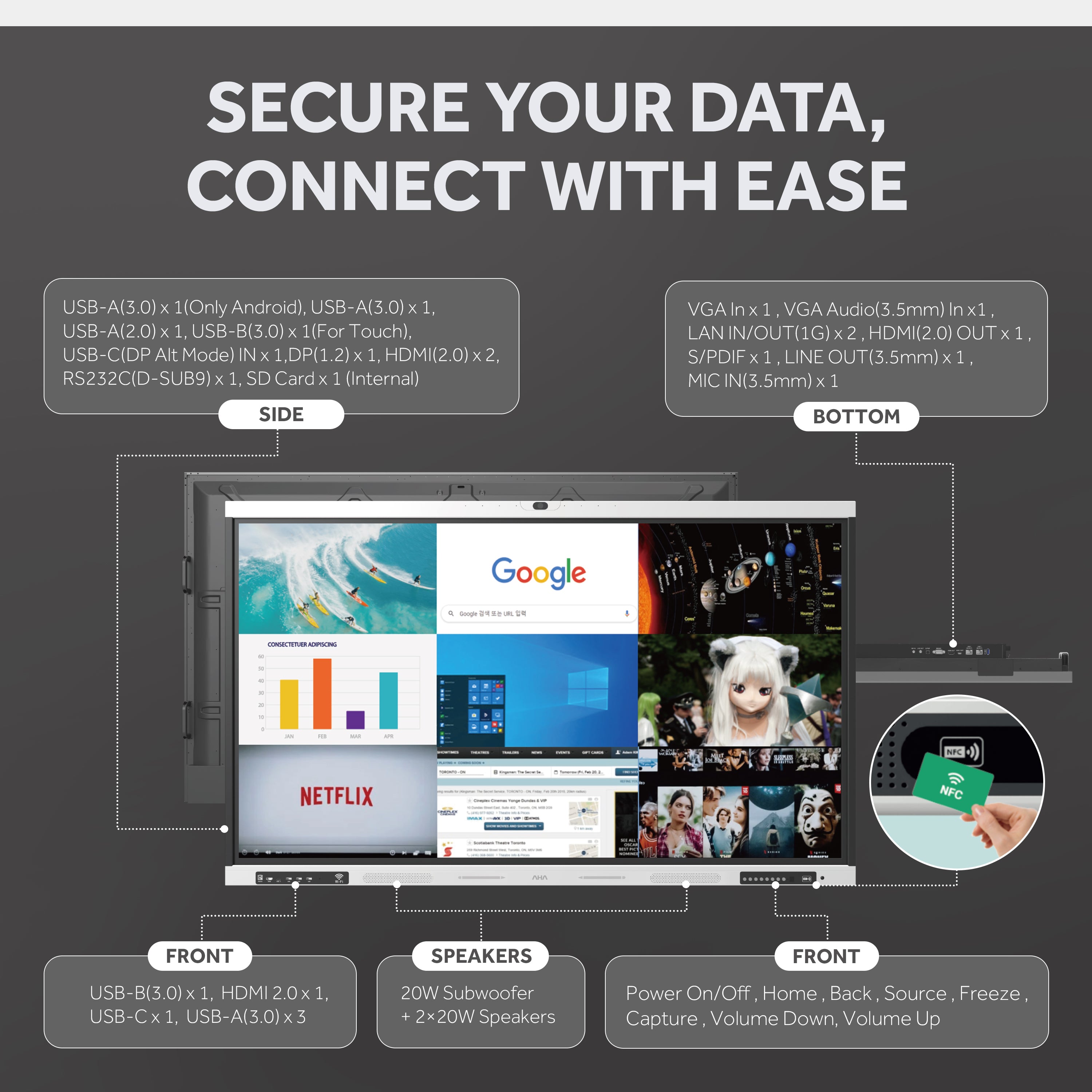 • The AHA Interactive Flat Panel Display Hybrid 7000 is equipped with the latest Android OS and a powerful Octa-core CPU to deliver fast and reliable performance.