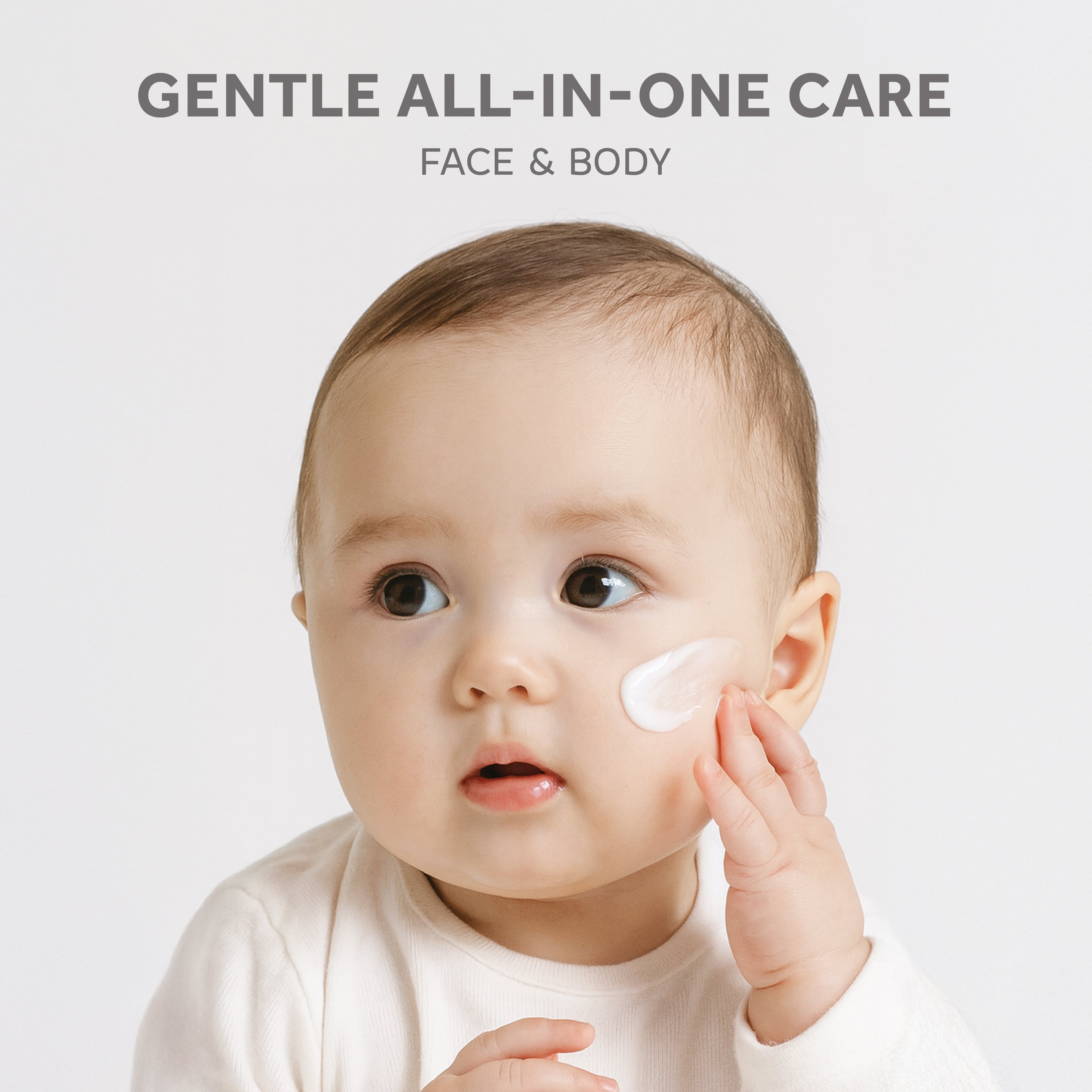 A gentle, fragrance-free all-in-one face and body cream for the whole family, from newborns to adults. Formulated with botanical extracts, ceramide, and hyaluronic acid to deliver deep, lasting hydration while protecting sensitive skin.